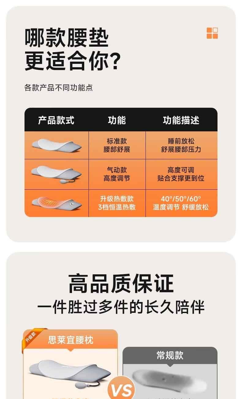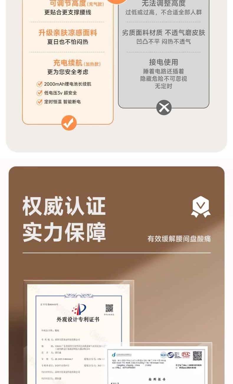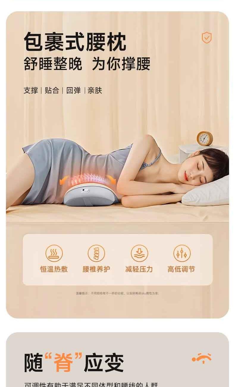【軸向拉伸】改善“腰椎突出”,緩解“疼痛僵硬”。 【3維度拉伸】分區(qū)拉伸, 3D無死角,腰椎呵護。 【巴斯夫進口記憶棉】間隙更小,吸收沖擊動能,不易變形。 【新科技面料】體感細膩,柔彈健康面料。 【可控溫】熱敷,三檔控溫: 45度、55度、65度,溫暖您的身心。 【智能定時】設(shè)計: 15分鐘、30分鐘、45分鐘,到點停止加熱。