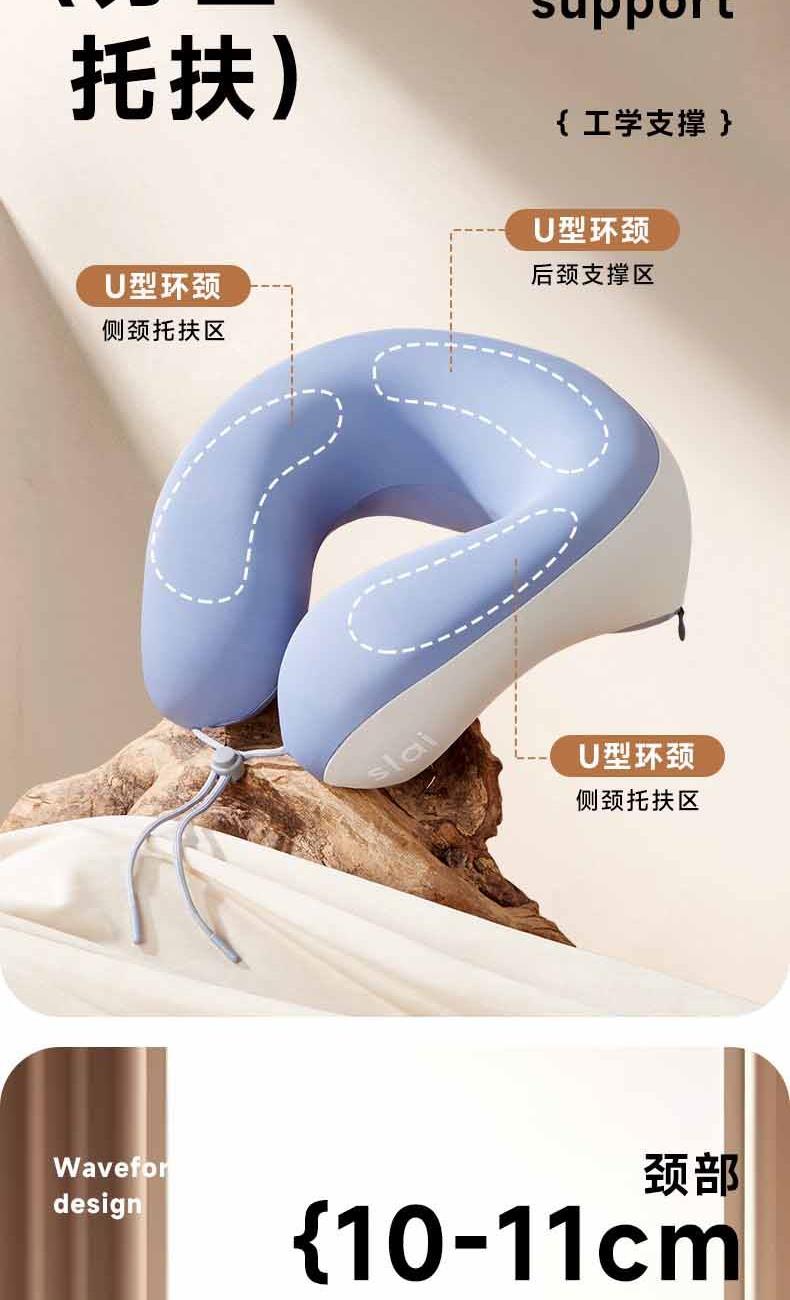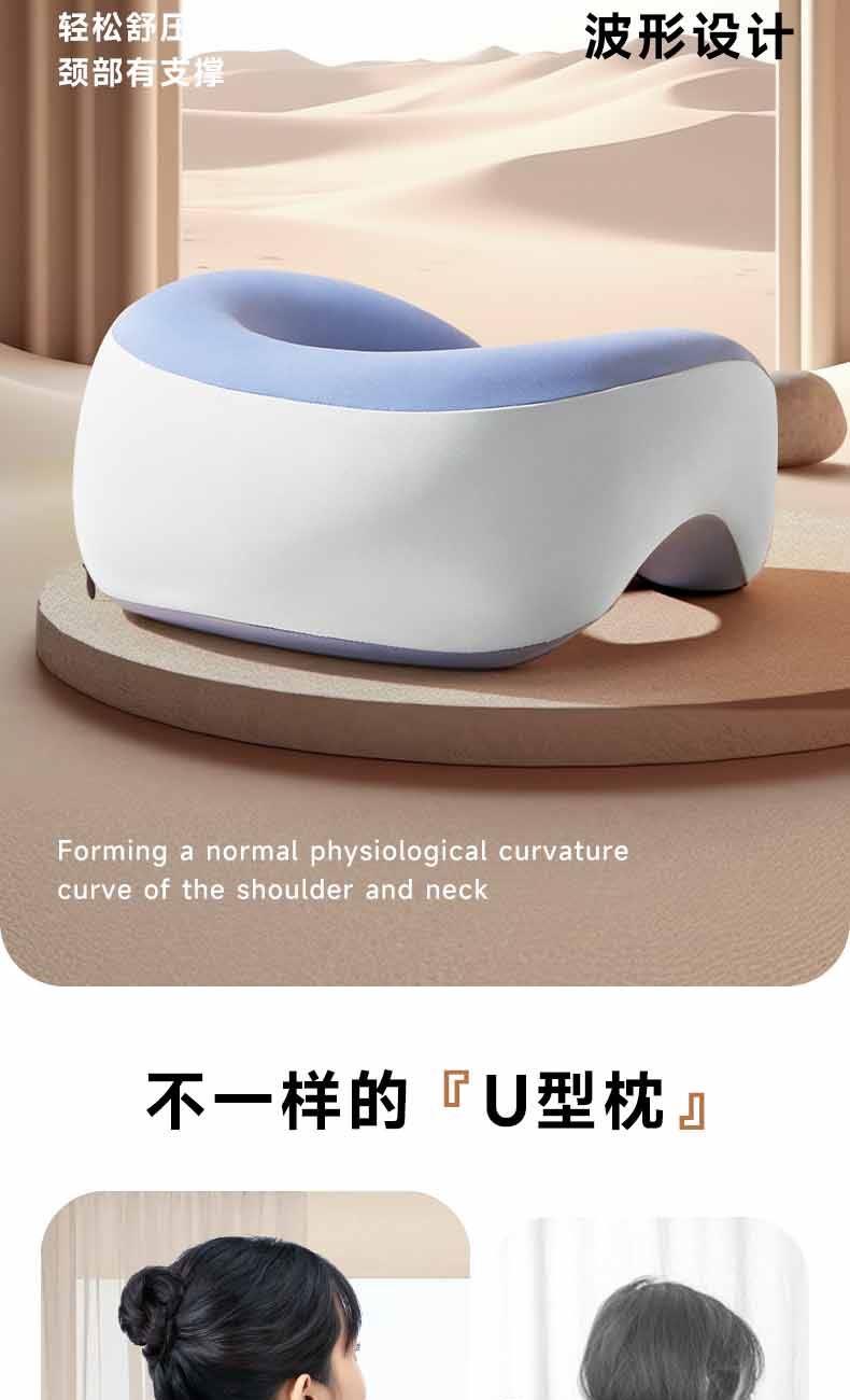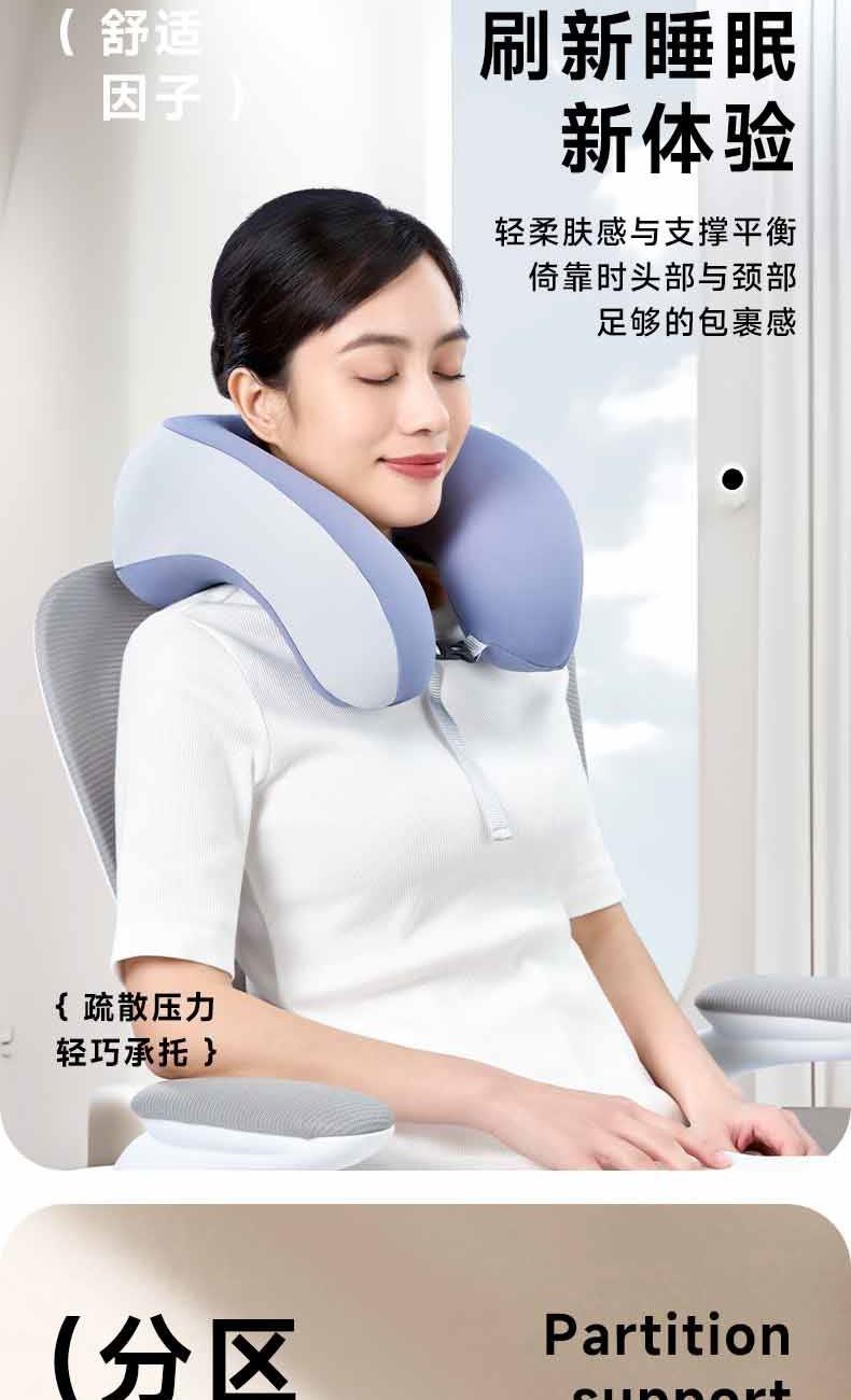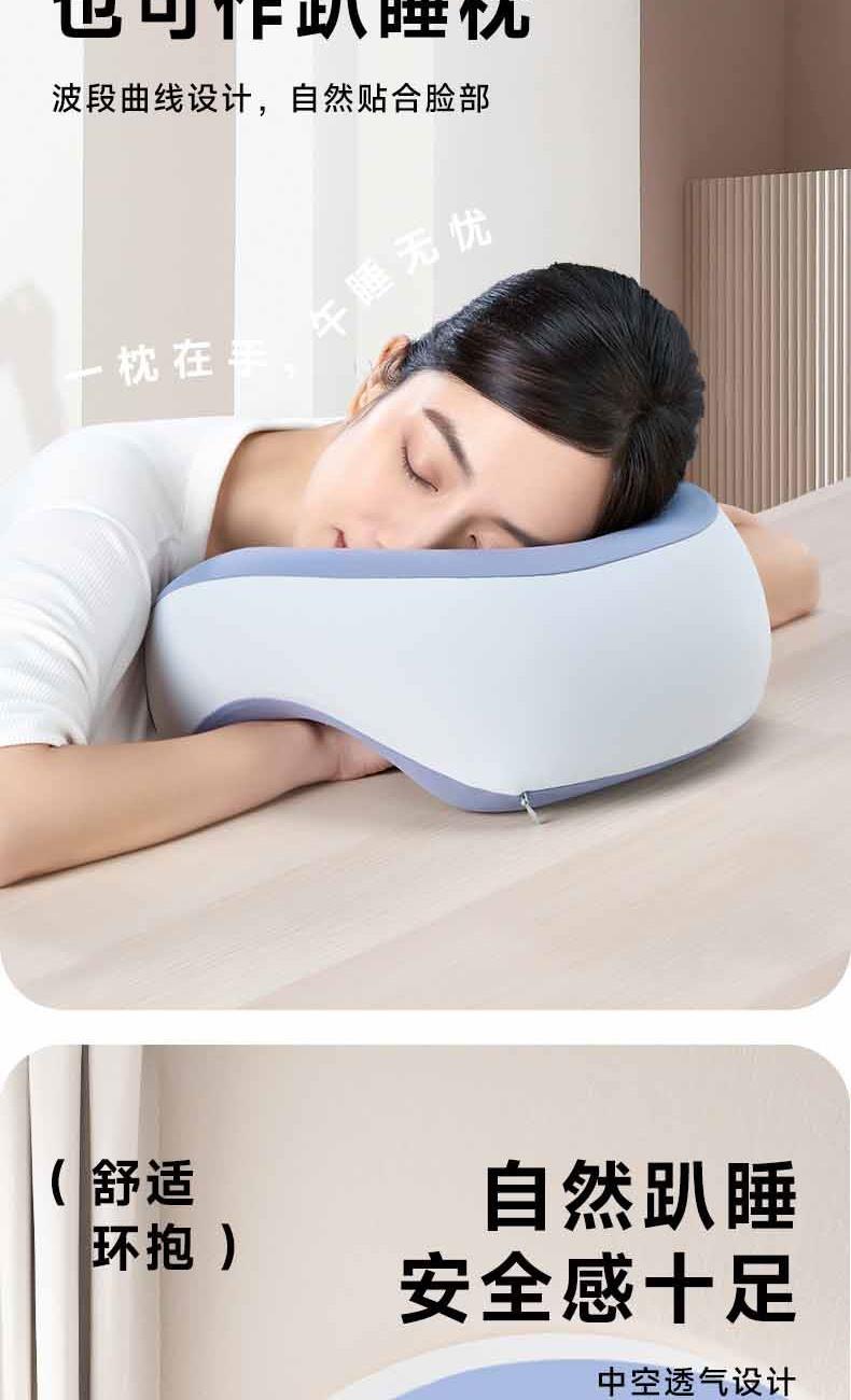 【人體工學(xué)設(shè)計】分區(qū)托扶,減輕頸部承壓; 【波段曲線設(shè)計】 自然貼合臉部,可趴睡使用; 【 U型開口設(shè)計】一秒可變u型枕,倚靠休息有支撐; 【親膚面料】透氣親膚不刺激